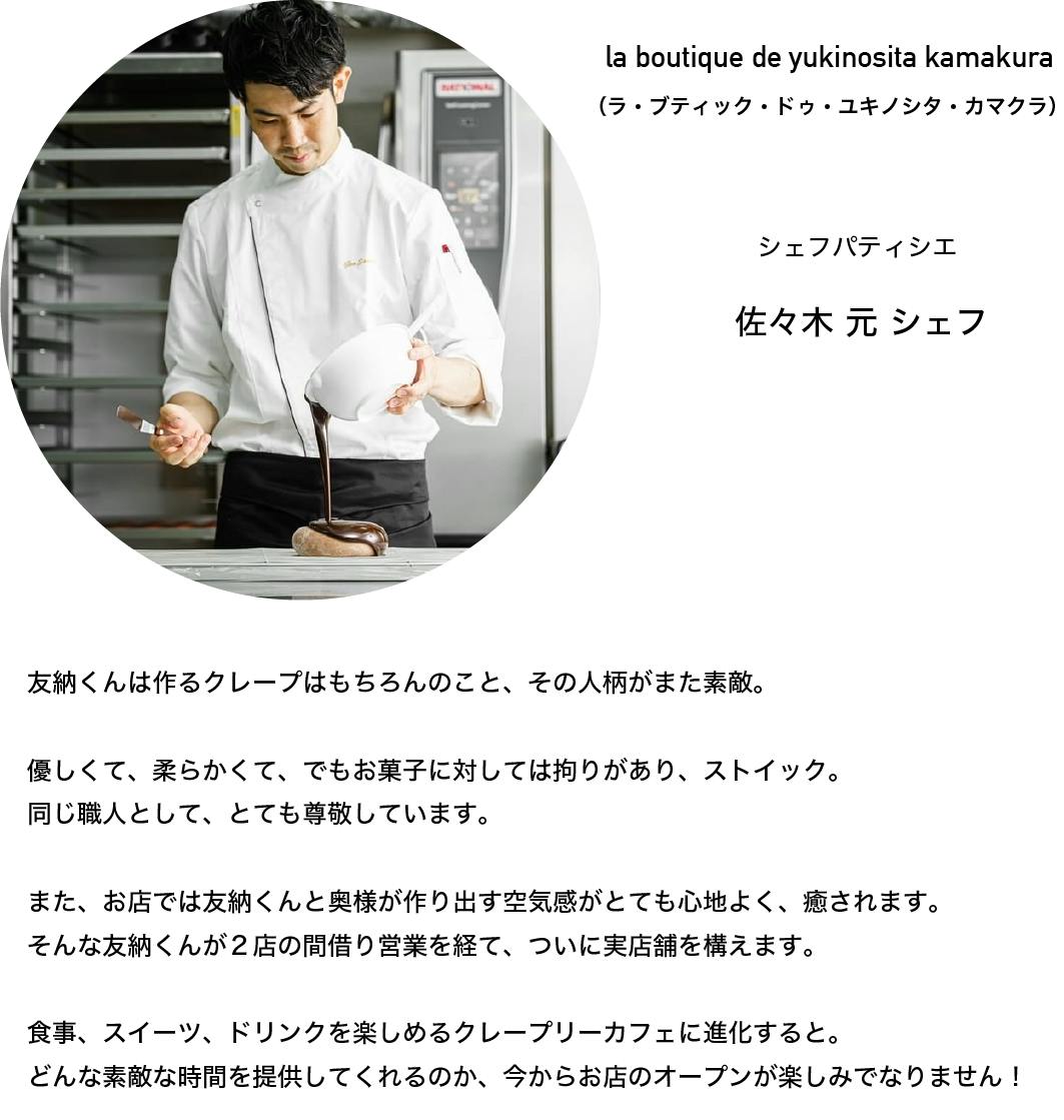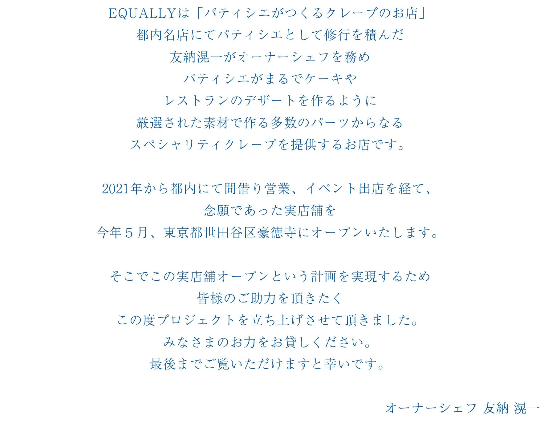 シェフパティシエ友納たった1人からはじまったEQUALLYですが、更にパティシエ数名に加え、料理人、バリスタ、サービスのプロフェッショナルが在籍することが決まっており、モーニング、ランチ、アフタヌーンの時間帯にお食事とスイーツとドリンクを楽しめるクレープリーカフェへ進化いたします。