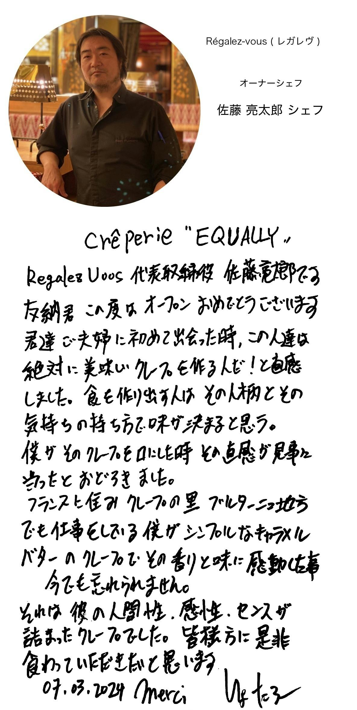 このEQUALLYの想いを届けるため、おいしさと温かみのあるおもてなしを提供できるよう努めていきたいと思います。