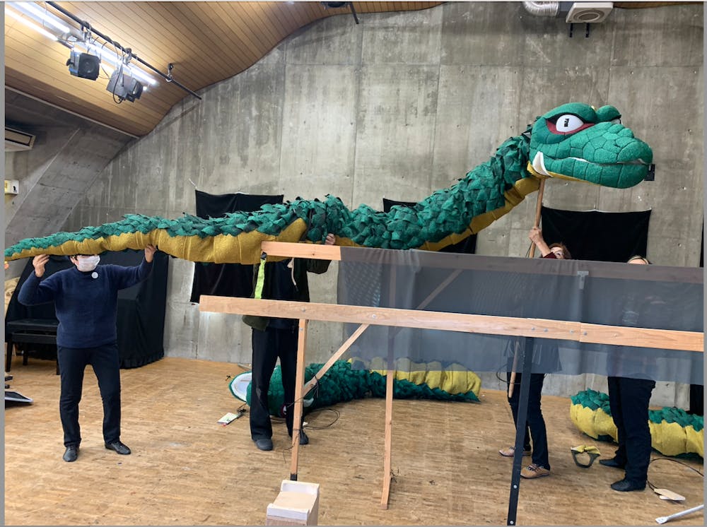 実は、当初はヤマタノオロチだったんですが、写真を見ていただく通り1体につき、大人3人が操演させる大きさ!