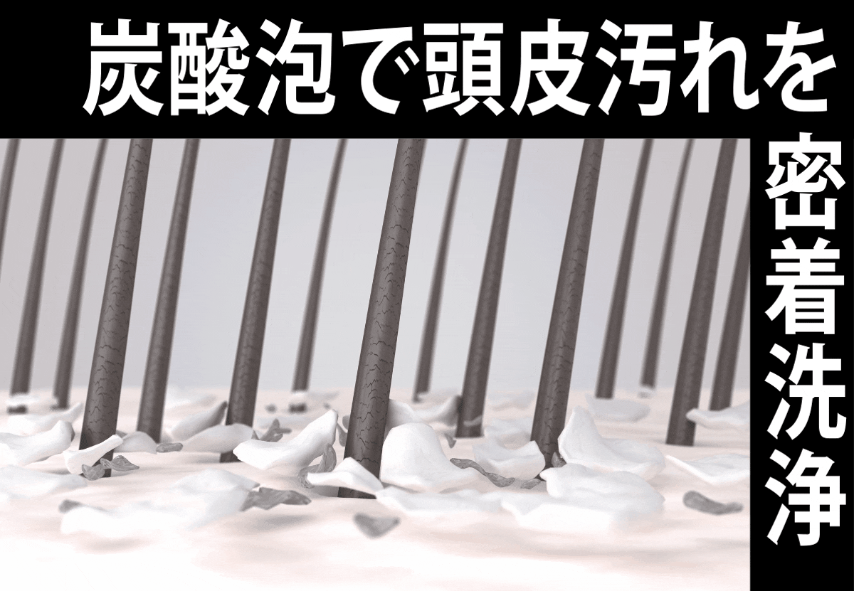 12,000ppmの高濃度炭酸を含む濃密な泡が髪と頭皮に密着。汚れを分解しながら浮かすことで、髪と頭皮に摩擦などのダメージを与えることなく汚れを洗浄します。