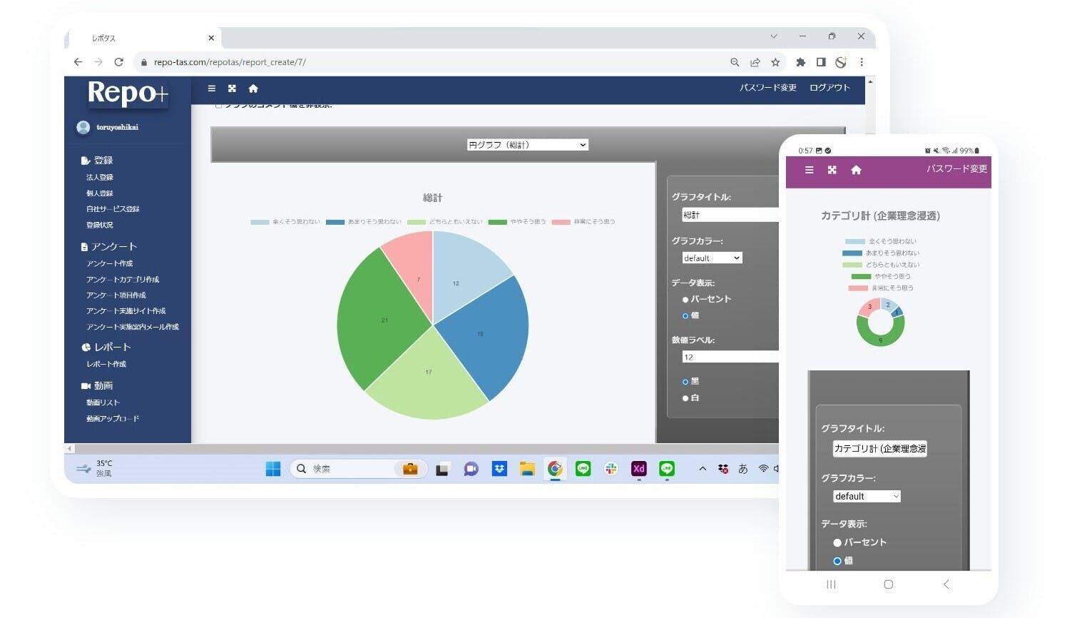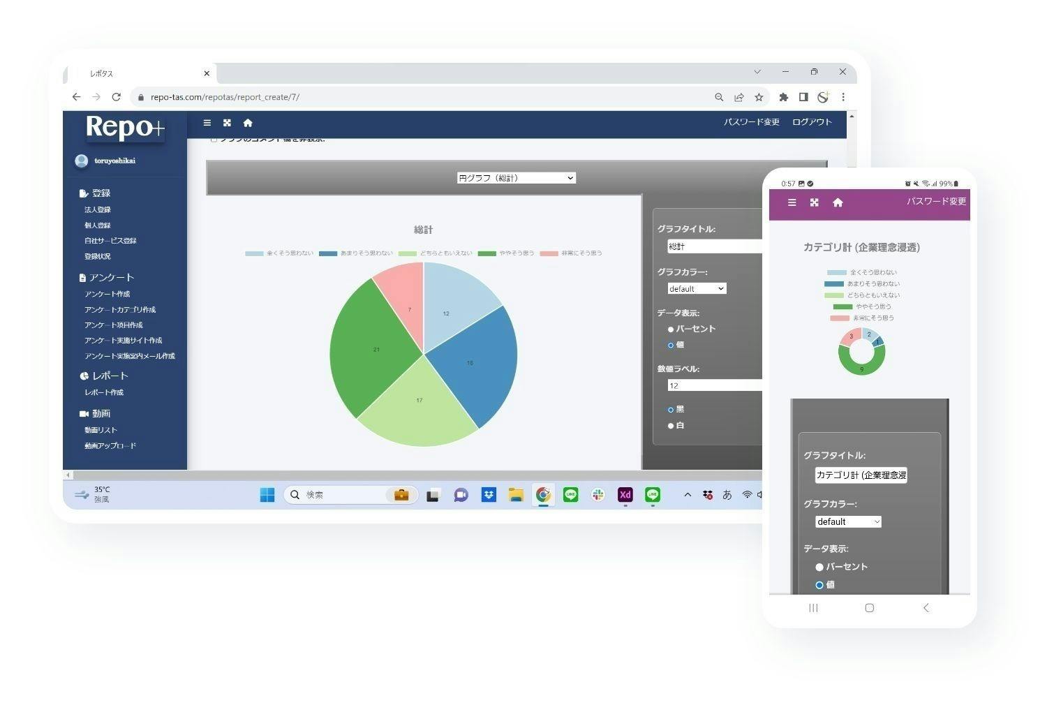 集計したアンケート結果を使って、好みのグラフや図を用いたデザイン性の高いレポートを、手間をかけずに簡単に作成することができます。
