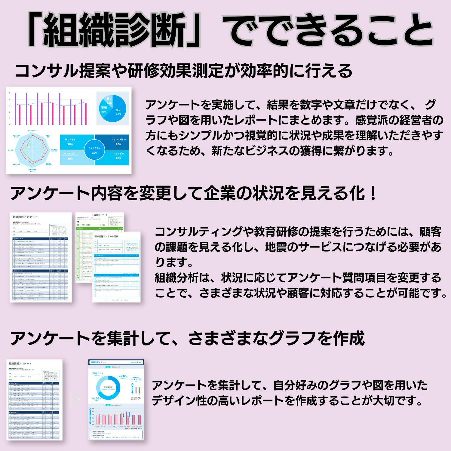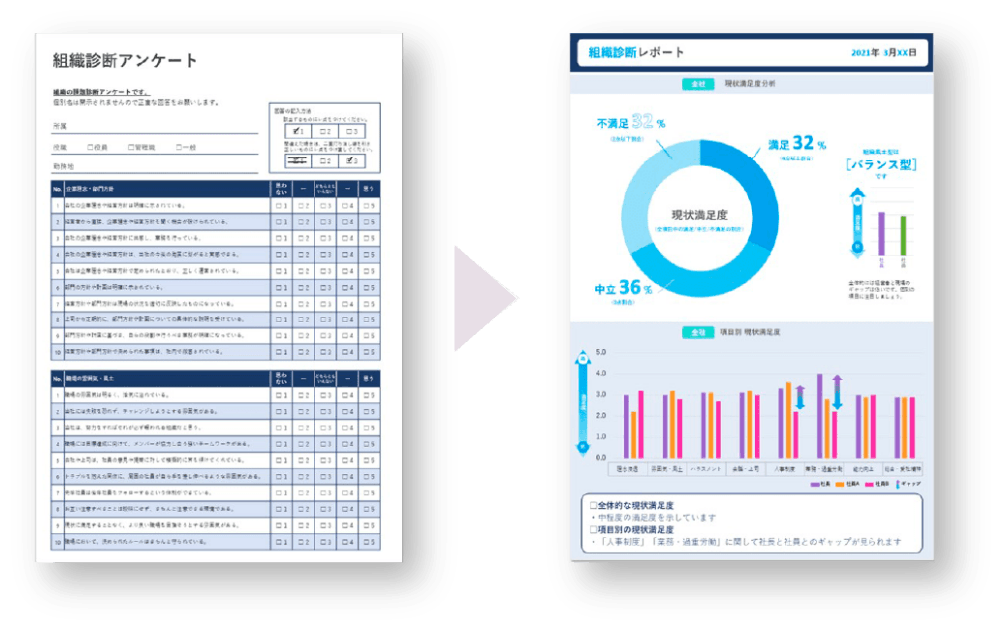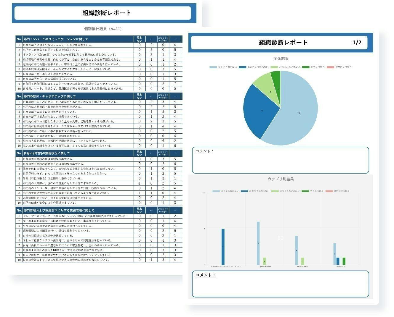 定期的に行うアンケートを通じて、組織の進捗や改善点を明確に示し、効果的な改善策を提案します。■カスタマイズ可能なアンケート: