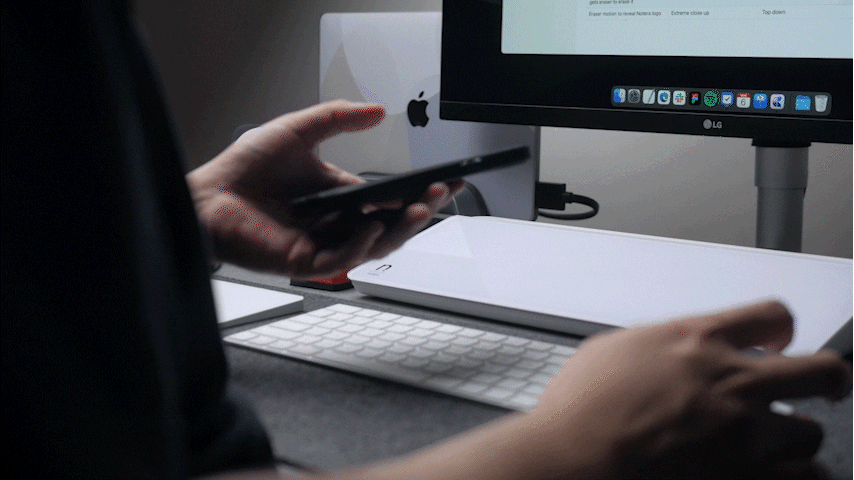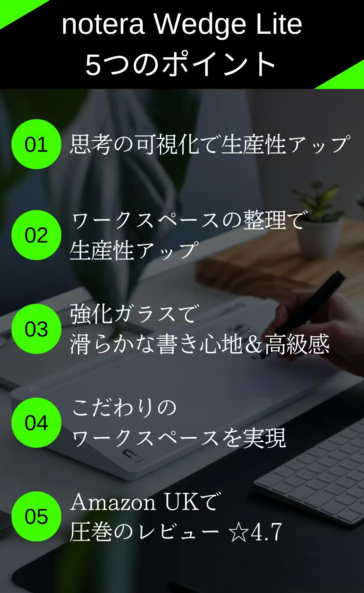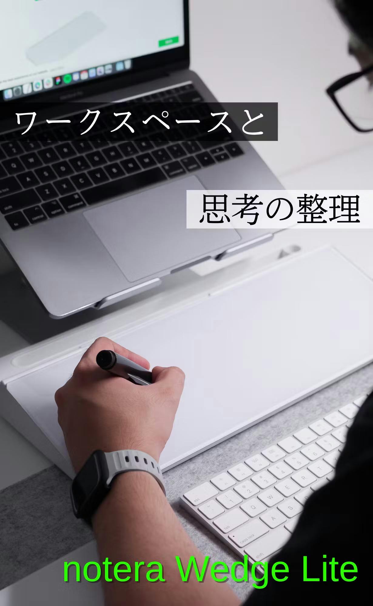 実際に、日常生活の中で浮かぶアイデアについての調査では、「手を動かして書くことでアイデアがひらめいたことがある」と答えた人が51.7%もいるそうです。notera Wedge Liteは生産性を上げるワークスペースを作ることを目的としており、「サッと」手書きメモができるデザインとなっています。