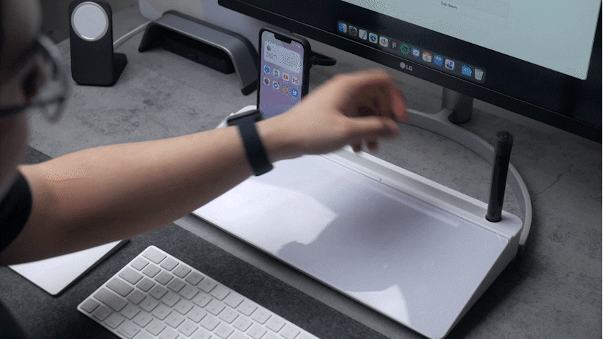 notera Wedge Liteには、スマホやタブレットを立てかけておける「くぼみ」があります。PC作業しながらスマホ画面も見たい時に嬉しい機能です。特にタブレットは、デスク上に寝かせて置いておくとデスクが圧迫されてしまうので、使っていない時も立てかけておくと作業スペースを確保できます。