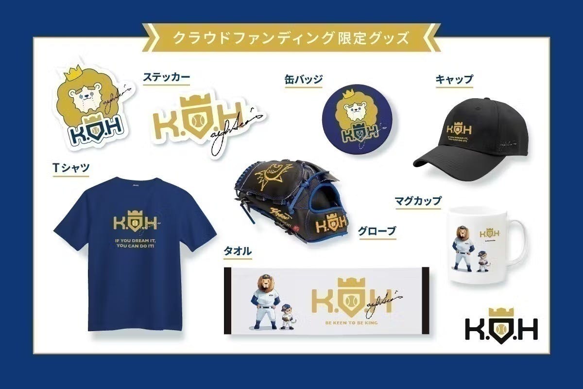 今回のK.O.Hオープン記念・クラウドファンディング限定の、菊池雄星サイン入りオリジナルデザインで作るグッズ全て(ベースボールキャップ、Tシャツ、スポーツタオル、マグカップ、缶バッジ、ステッカー)と、菊池雄星の直筆サイン入りMLBボールをセットにしたリターンコースです。全アイテムが欲しい方のためのお得な限定セットです。
