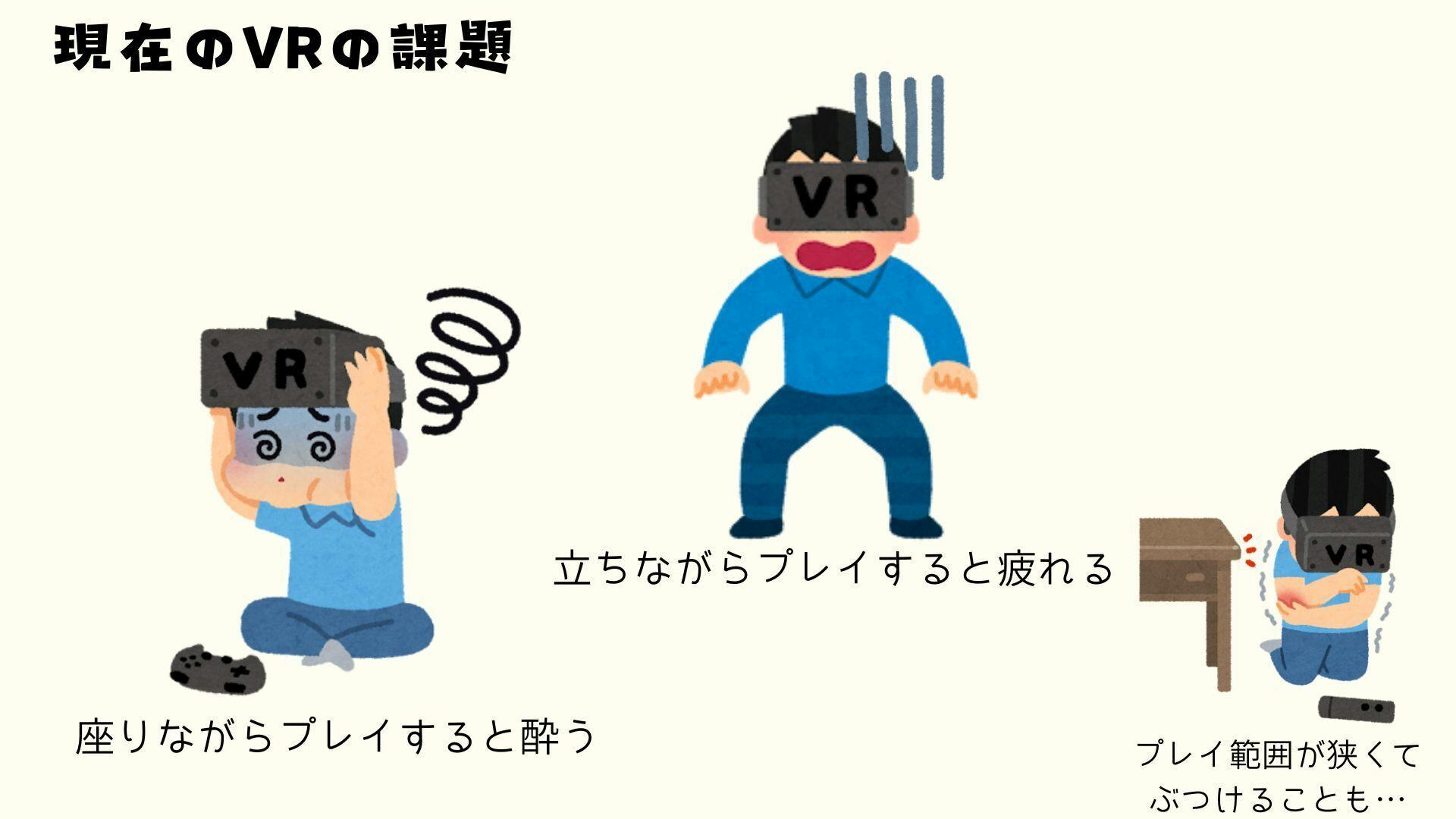今までは、VRゲームを狭い部屋で遊ぶとき、コントローラのスティックを使ってVR空間を移動する必要がありました。その際、座って遊ぶと視覚情報と身体感覚のズレが激しく、VR酔いの原因となり長時間のプレイを妨げていました。