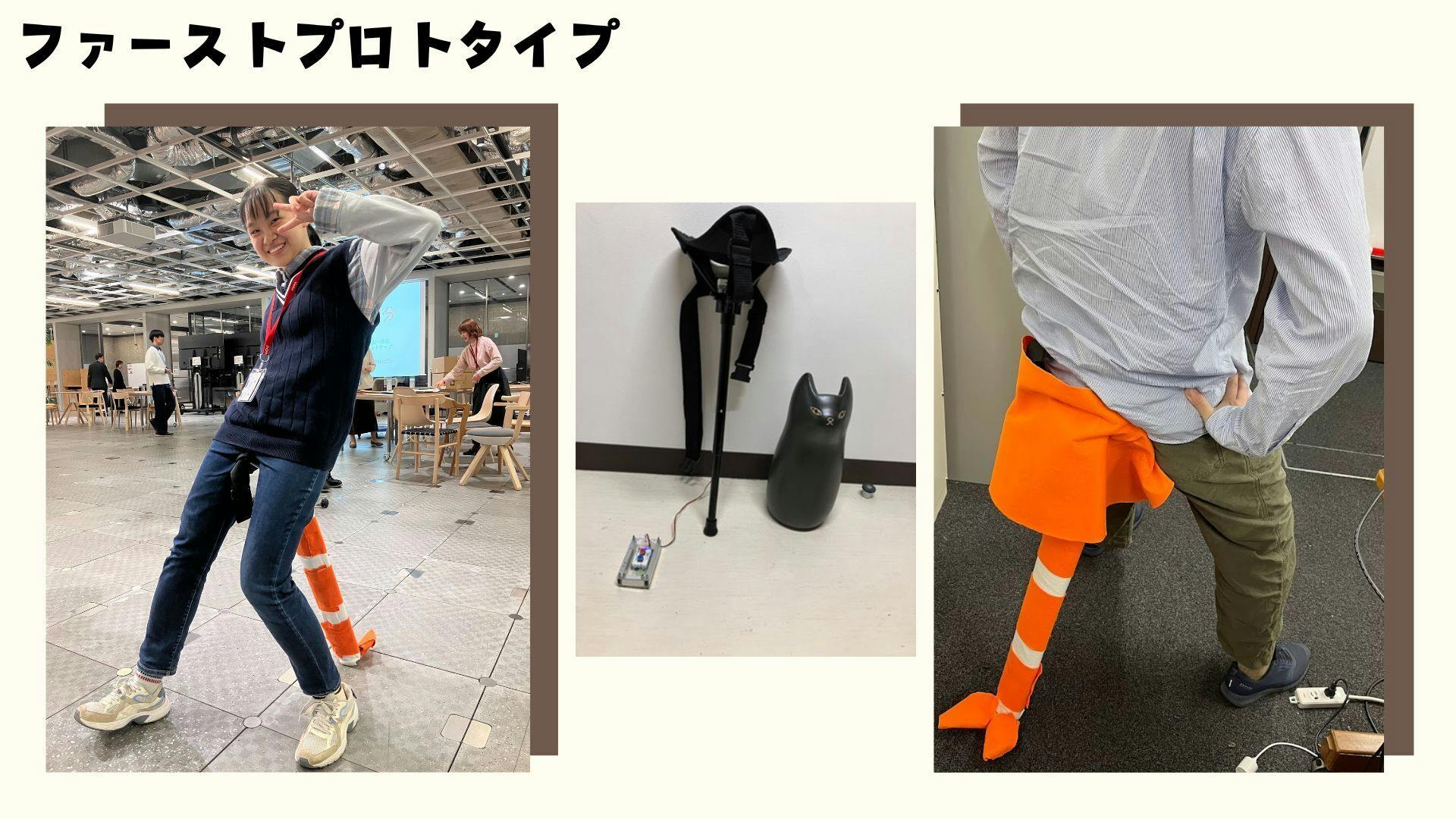 プロジェクト初期は、一脚椅子×ゲームコントローラに着目しました。にゅーぼのファーストプロトはしっぽのような一脚椅子を装着しながら、VRヘッドセットを装着し、身体の動きに合わせてゲーム空間を移動するようなプロダクトでした。