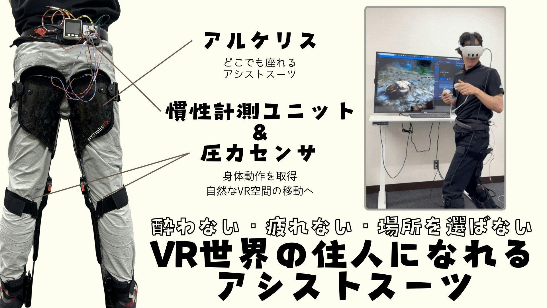 「にゅーぼ」は、どこでも座れるアシストスーツ「アルケリス」をベースに、組み込まれたセンサによって身体の動きを検知してVR空間の”肉体”へと反映させます。