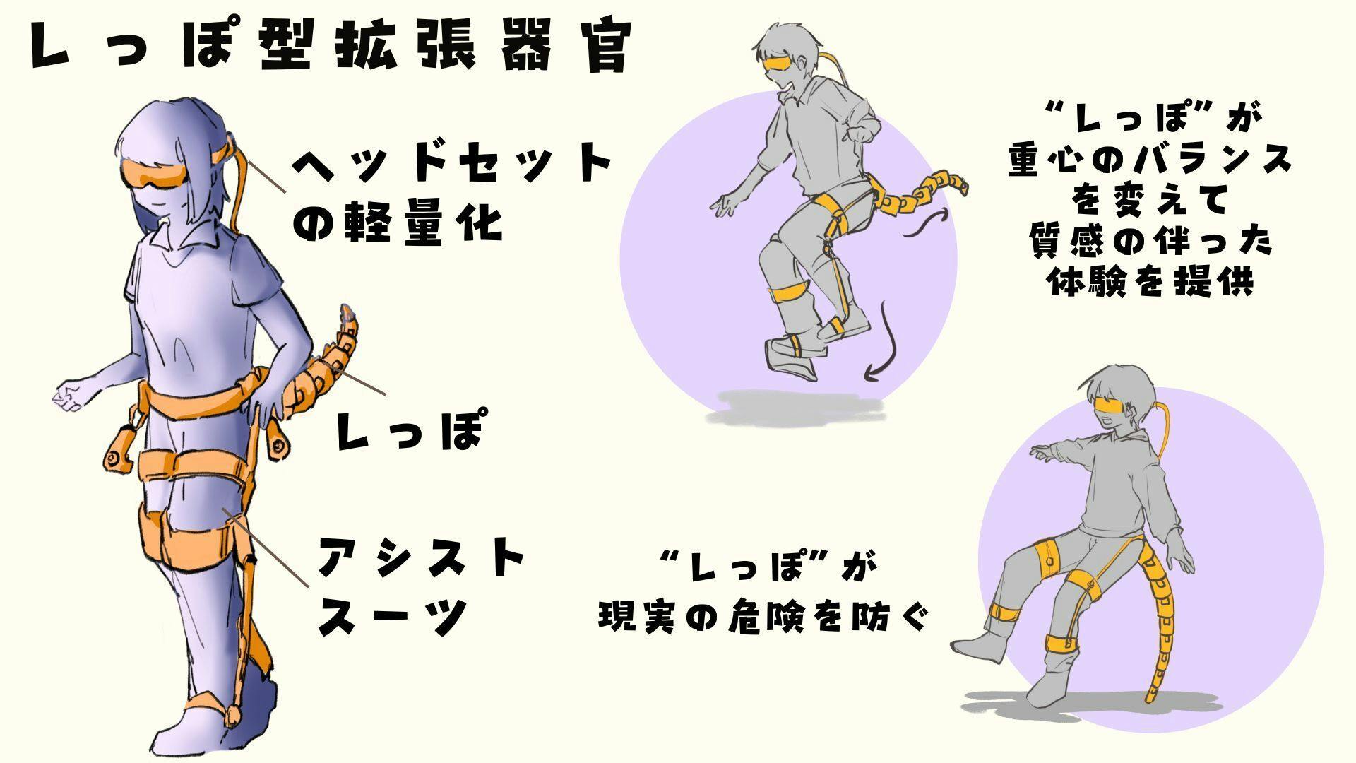 私たちは、このような技術の応用先として、“しっぽ”型の拡張器官を考えています。この器官は2つの機能を持ちます。一つは、”しっぽ”が身体の重心を制御することで、VR体験をより質感の伴ったリアルな体験にします。そして、二つ目はバランスを崩したときなど現実で危険が迫った時に、”しっぽ”が身体を支え、怪我や事故を未然に防ぎます。他にも、腰の部分にバッテリーやデバイスの処理機能を持ってくることでヘッドセットを軽量化する事ができます。このようにして、VRを身近で安全なテクノロジーへと変化させます。