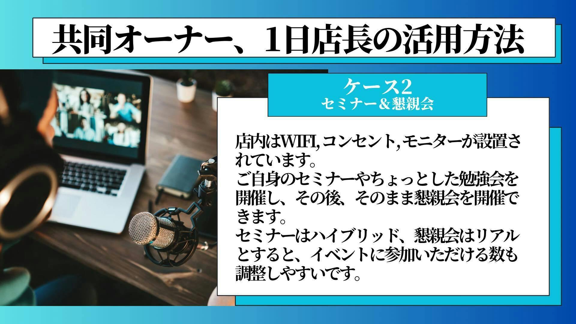 セミナーやイベントから懇親会までを貸切で使用できます。