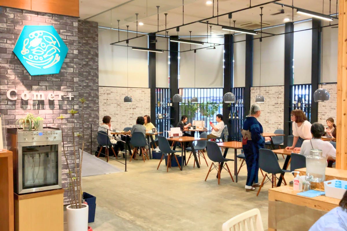 館内の中心部に大きな休憩スペースがあります。木目調を中心としたお洒落な空間に、ランチやお茶のみ、勉強に休憩など、地域の方々が思い思いに過ごしています。休憩スペース内にあるお店「Comer+(コメールプラス)」ではナポリピッツァ職⼈協会が技術を保証する「認定職⼈」がまき窯で焼く本格「ナポリピッツァ」を食べることもできます。