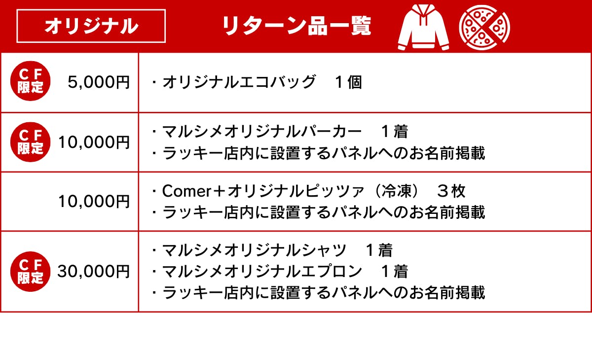 クラウドファンディング限定でオリジナルグッズを準備しました!さらに「Comer+」の店内でしか食べられない人気のピッツァ3種を特別にお届けするプランもご用意しております。