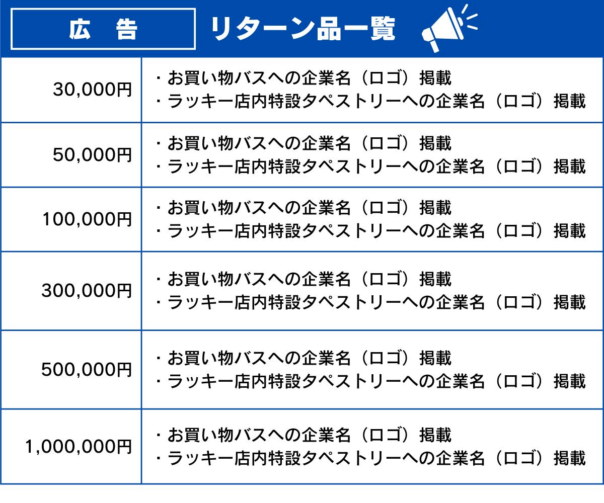 「お買い物バス」や店内広告スペースでPRをしていただくための企業/団体様向けの広告プランもご用意しております。「お買い物バス」のオフィシャルスポンサーとして、皆様のPRにご活用ください!