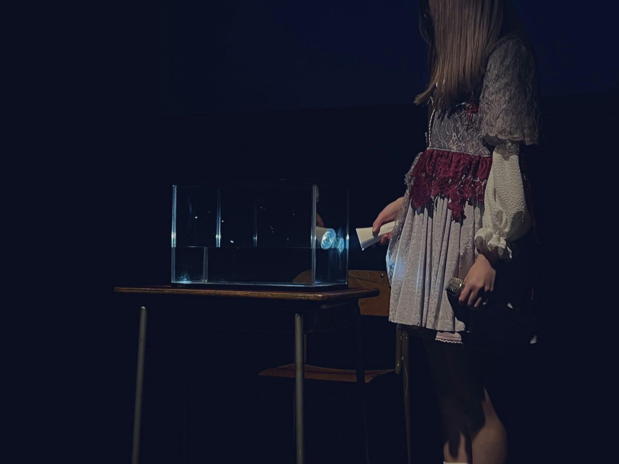 2023年の甲斐莉乃 生(誕)『人生』では、はじめて80分に渡るソロ公演を行い、自分にとってすごく大きな挑戦をしました。自身でライブの構成や演出を組み立て、「布団」、「学校の勉強机と椅子」、「水槽」などの大道具を使った、少し大がかりなライブをお届けしました。