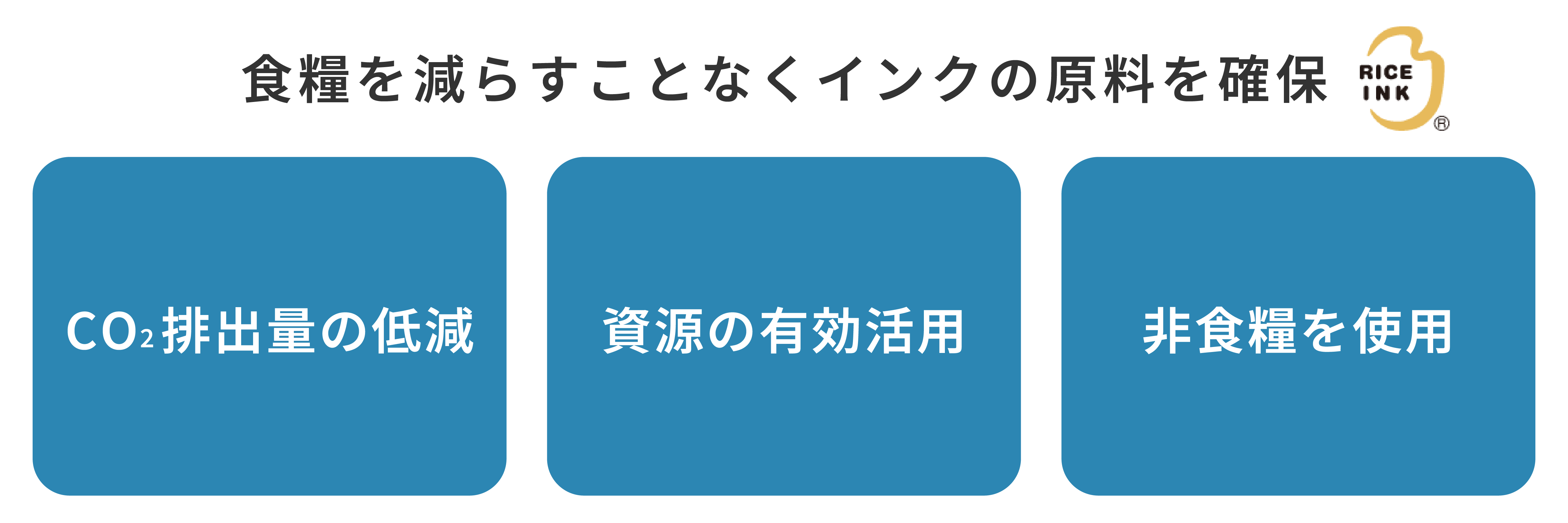 国産米からとれる米ぬかを利用しているため、大豆を海外から輸入する大豆インクに比べて、製造に必要な原料の輸送距離が短くなり、輸送時のCO₂排出量を大幅に低減します。