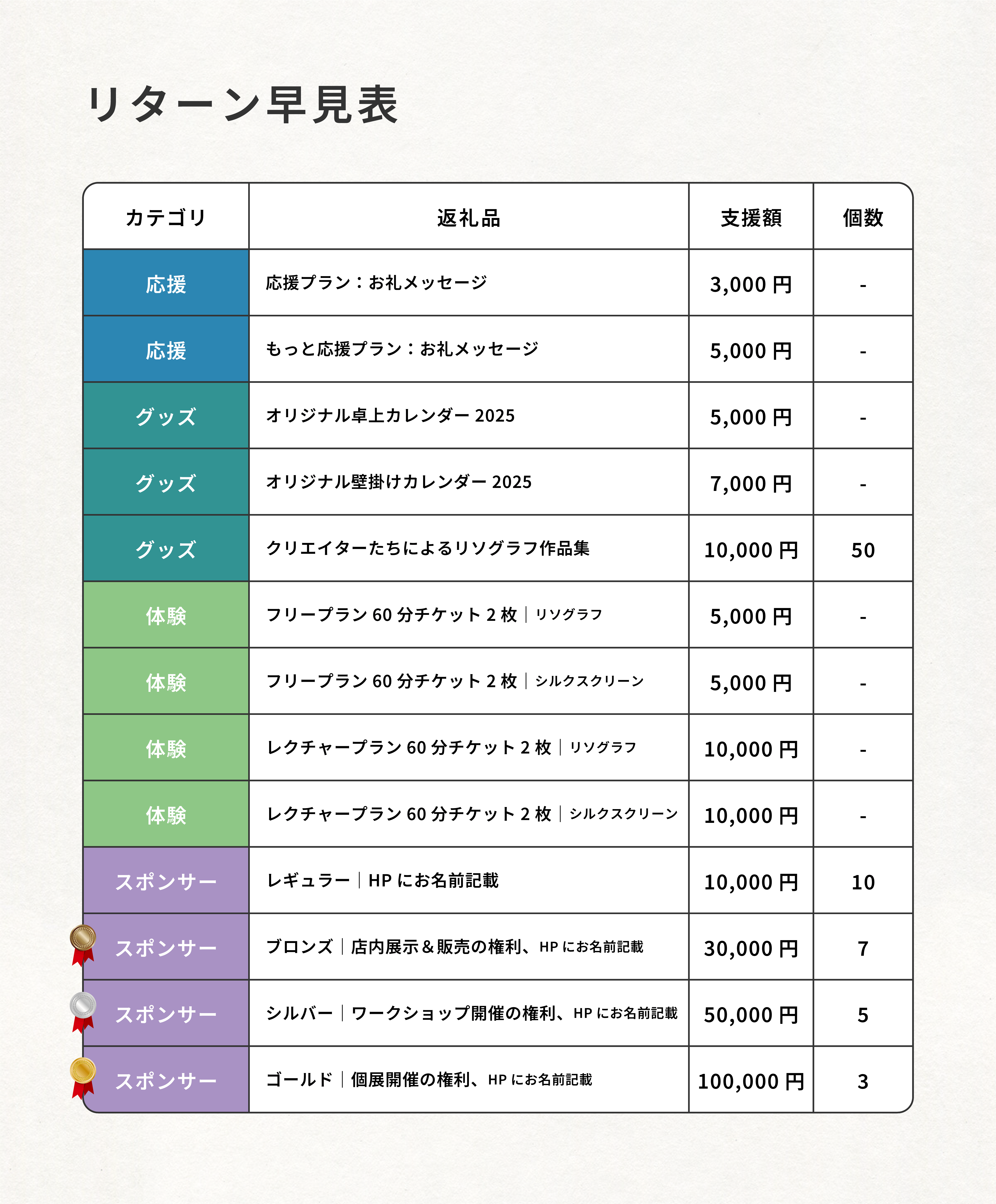 その想いを込めて、4つのカテゴリでリターンをご用意いたしました。