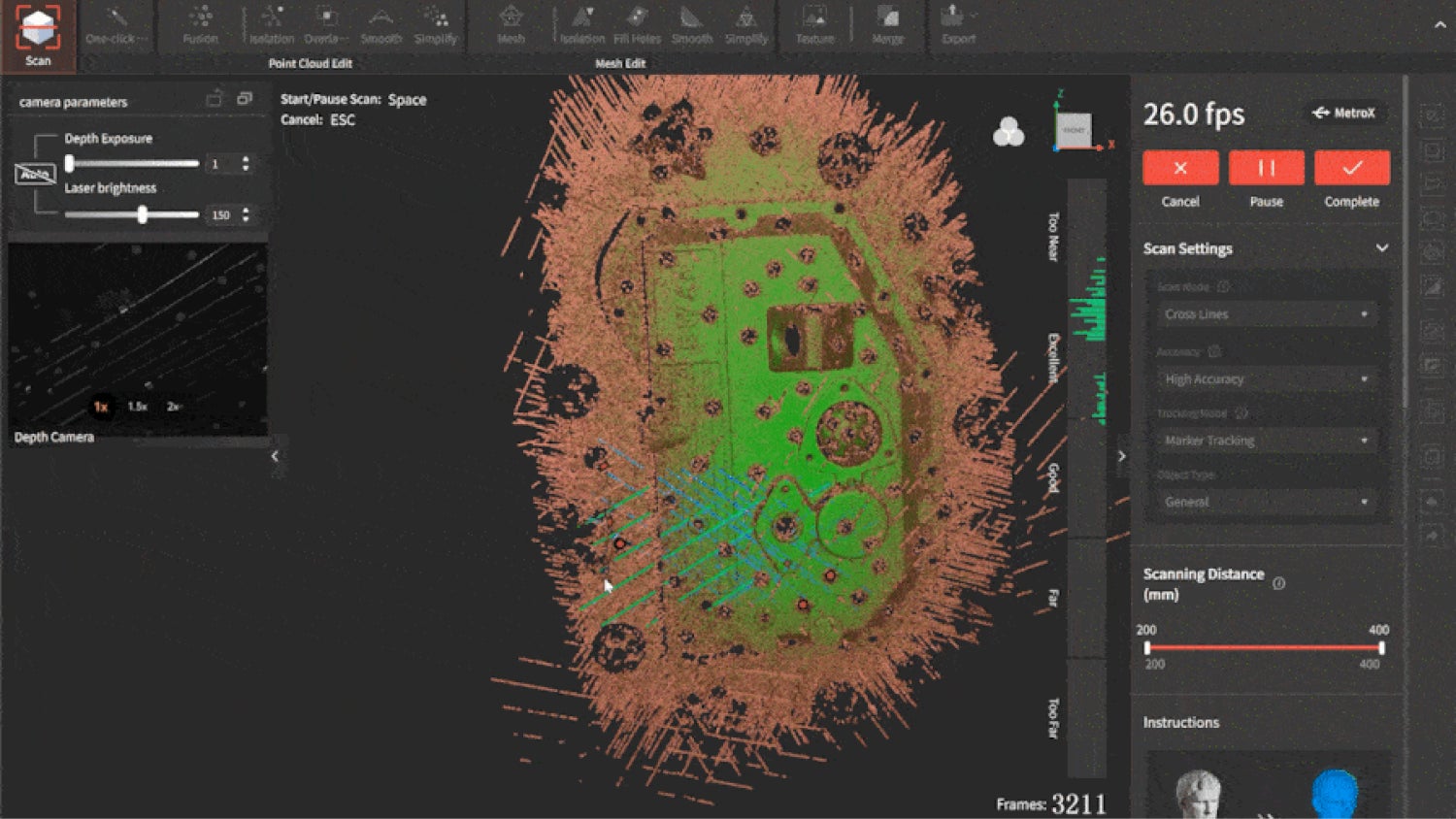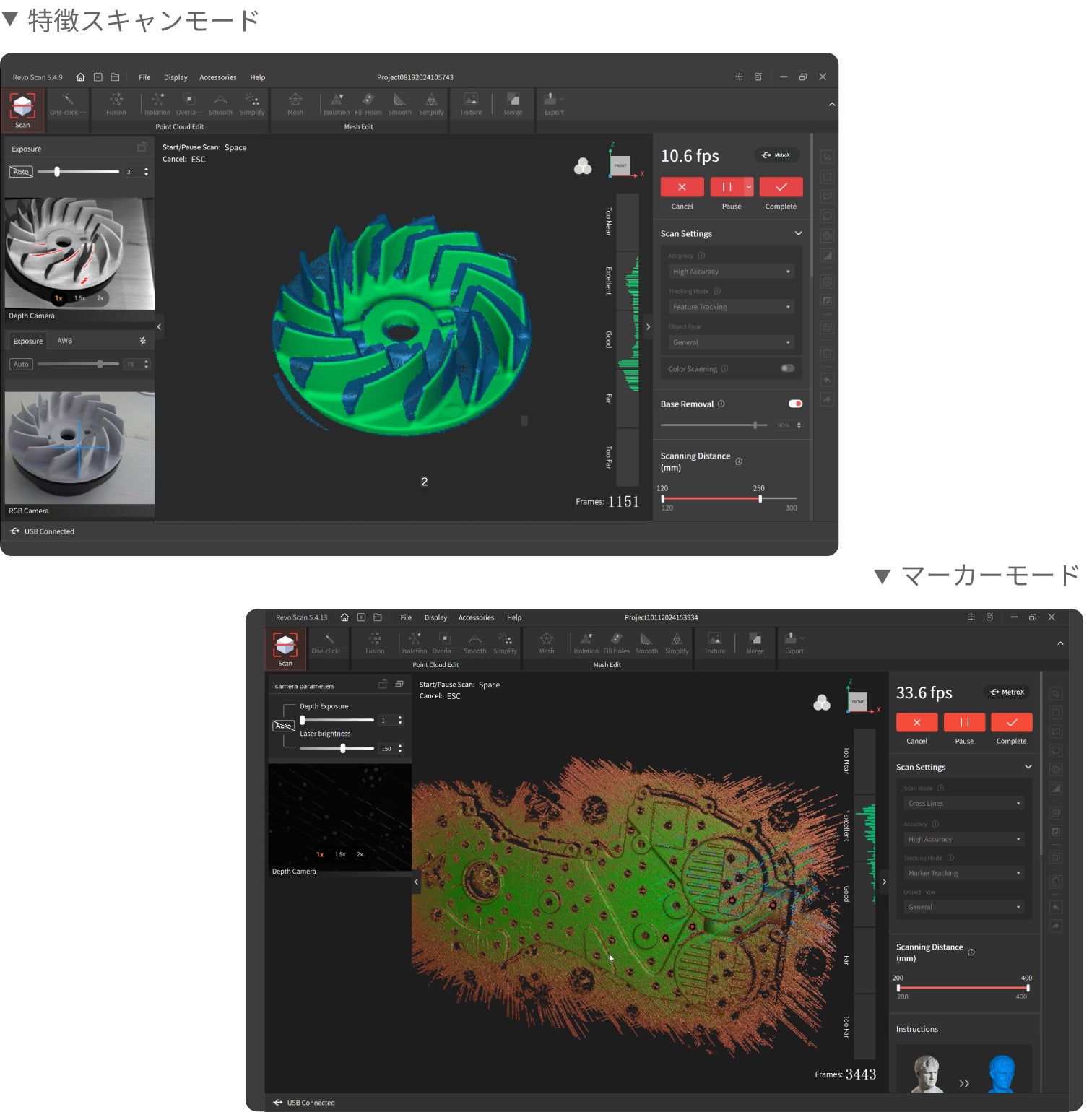 はい、マーカートラッキングモードでは、スキャンを一時停止し、別のモードに切り替えてからスキャンを再開できます。また、異なるスキャンモードを使用してオブジェクトのさまざまな部分からデータを取得し、弊社開発のRevo Scanソフトウェアでこのデータを統合することで、より完全で正確な3Dモデルを作成できます。この方法は、複雑または大きなオブジェクトのスキャンに特に適しています。