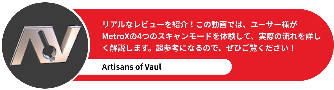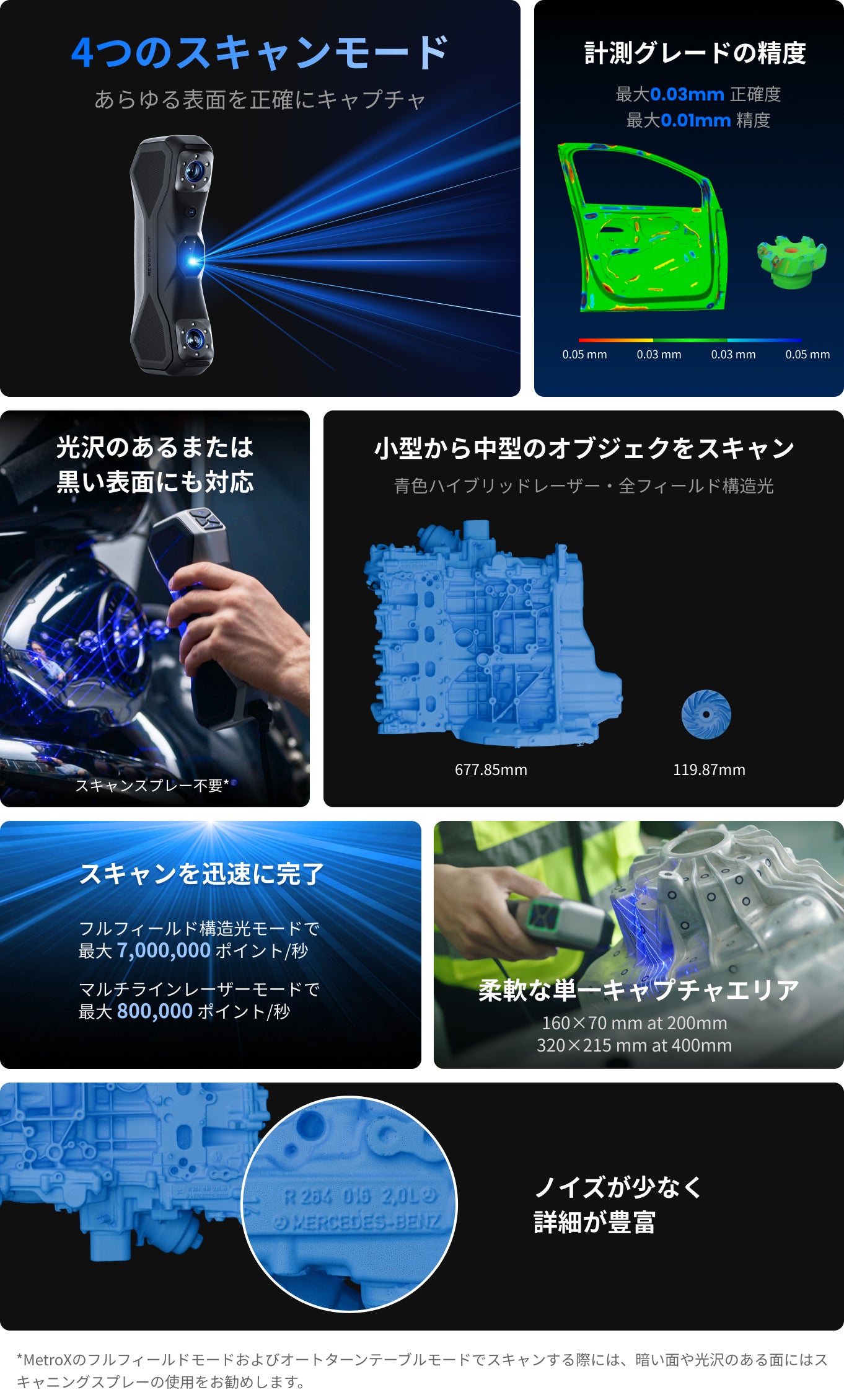 MetroXは、「ブルーハイブリッドレーザーライン」と「全フィールド構造光」という革新的な技術を搭載した3Dスキャナーです。 4つのスキャンモードを備え、プロのニーズにも対応する高精度でありながら、お求めやすい価格を実現しました。 あらゆる形状の対象物を簡単にスキャンし、ワークフローを効率化できます。