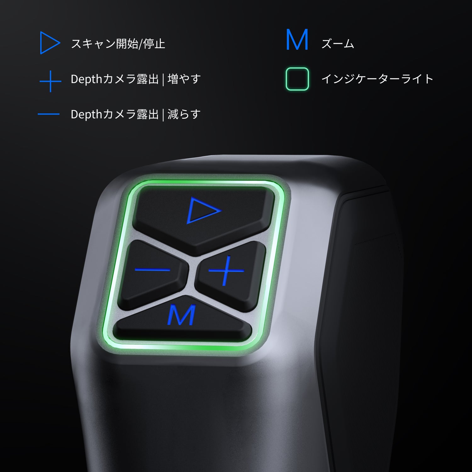 MetroXの4ボタンコントロールシステムを使えば、スキャンを簡単に操作できます。開始/一時停止、深度カメラの露出の調整、ズームイン/アウトなどを、すべて手元でスムーズに行えます。