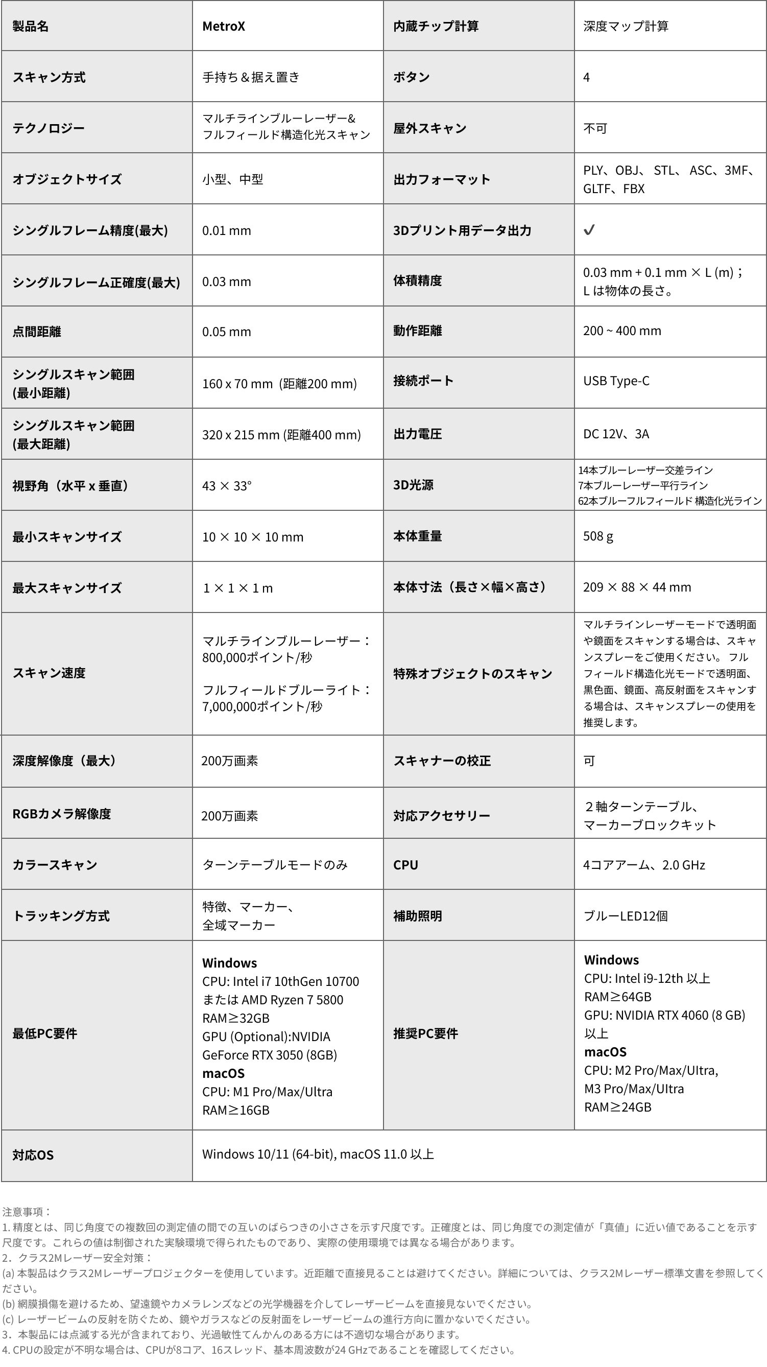 ほとんどの産業用レーザースキャナーと同様に、MetroXは人や動物をスキャンするのには適していません。MetroXを使用する際は、レーザービームを直接見ないでください 。MetroXは小型から中型のオブジェクトをスキャンするために設計されており、クラス2Mレーザープロジェクターを使用しています。クラス2Mレーザーは、偶然に裸眼で見ることは通常安全ですが、光学機器を使って見る場合やレーザービームを長時間見つめることは危険です。