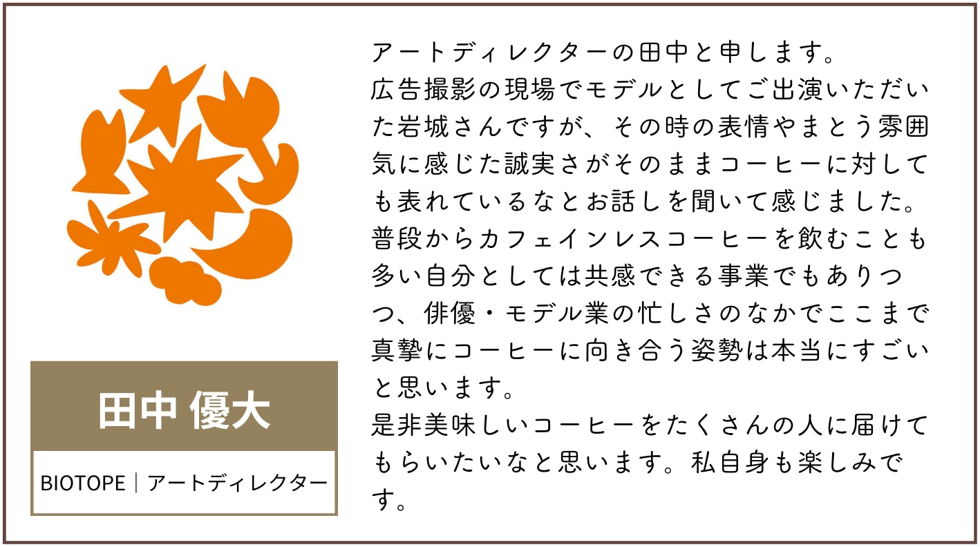 このプロジェクトをご覧いただきまして、ありがとうございます。Gentle Coffee Roasters(ジェントル・コーヒー・ロースターズ)の岩城滉太です。俳優として活動しながら、EC販売をメインにカフェイン残留率0.1%以下のコーヒー豆を販売している自家焙煎コーヒーショップのオーナーをしています。