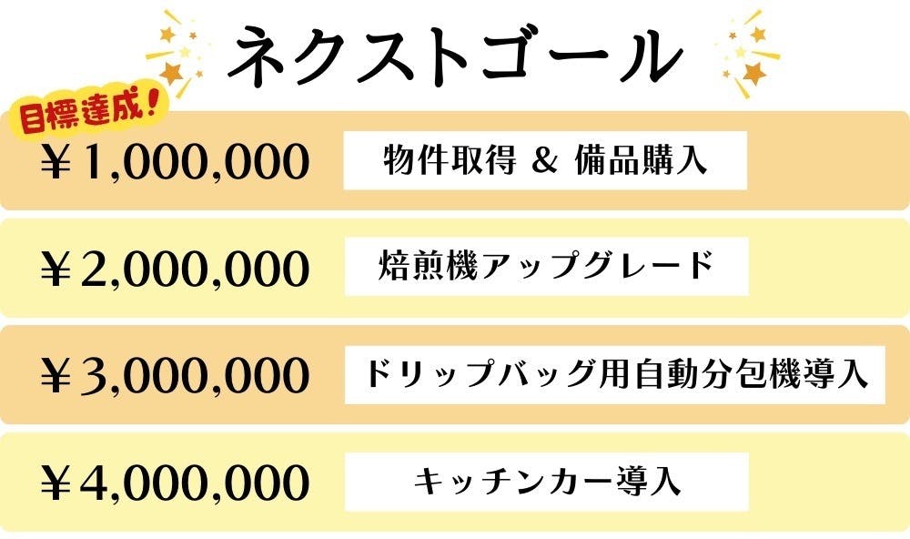 現在、都内に自宅とは別に焙煎所があり、日々焙煎を行っているのですが、この2つの商品を追加するには、現在の焙煎所の環境では製造に必要なコーヒー豆の焙煎が間に合わないため、焙煎所の規模を拡大し焙煎機をリニューアルすることで、焙煎量を増やしカバーできるようにしたいと思っています!