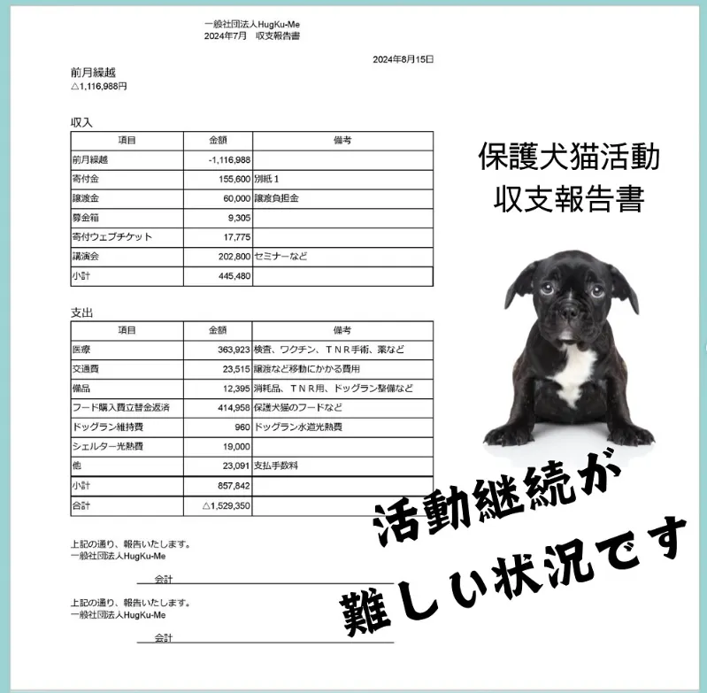 私たちは経済的に自立した活動を目指していますが、保護した犬猫の状態によっては高額な医療費を負担することも多く、運営は厳しい状況にあります。