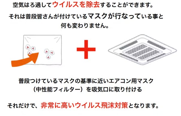 原因がなければ結果はありません。つまりウイルスがなければ、人にうつることはないのです。私たちがマスクをするように、公共施設などのエアコンにも中性能フィルターというマスクがついていれば安心ですよね。