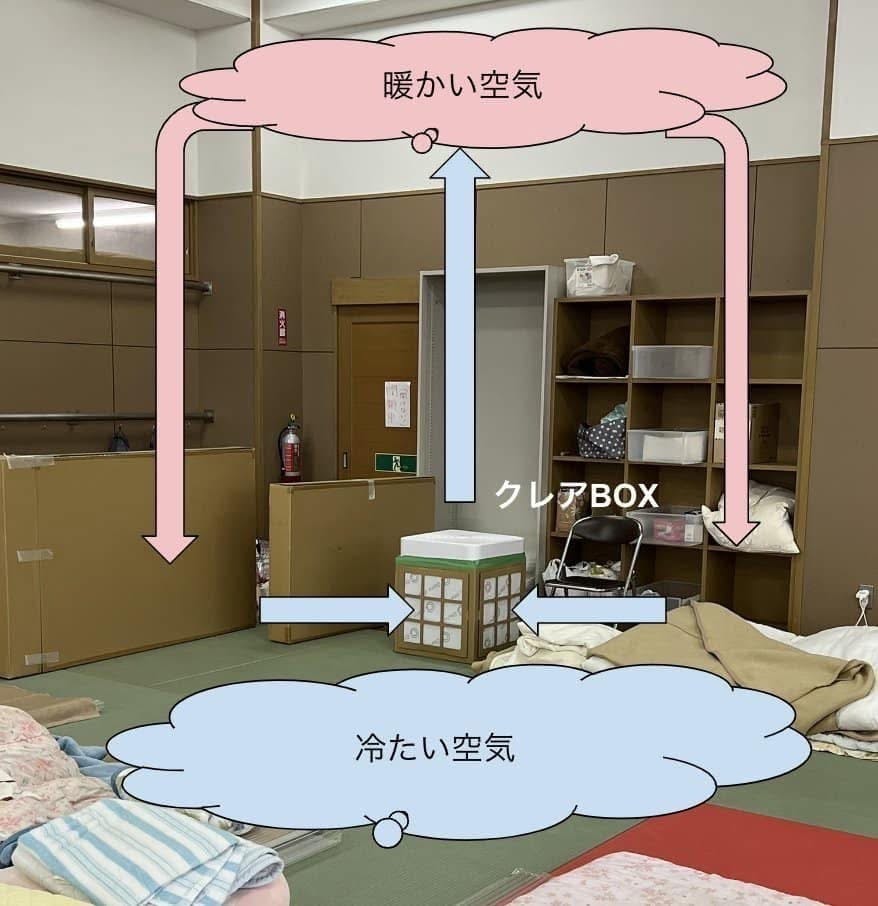 7mもある天井付近に暖房の空気が溜まり、避難者が寝ていた床付近は非常に低温でしたが、クレアウィンボックスは大風量、体育館に10台以上設置、下の冷えた空気を温かい天井まで吹き上げ、温かい空気を床まで下ろすというサーキュレーター効果でみなさんに喜んでいただきました。