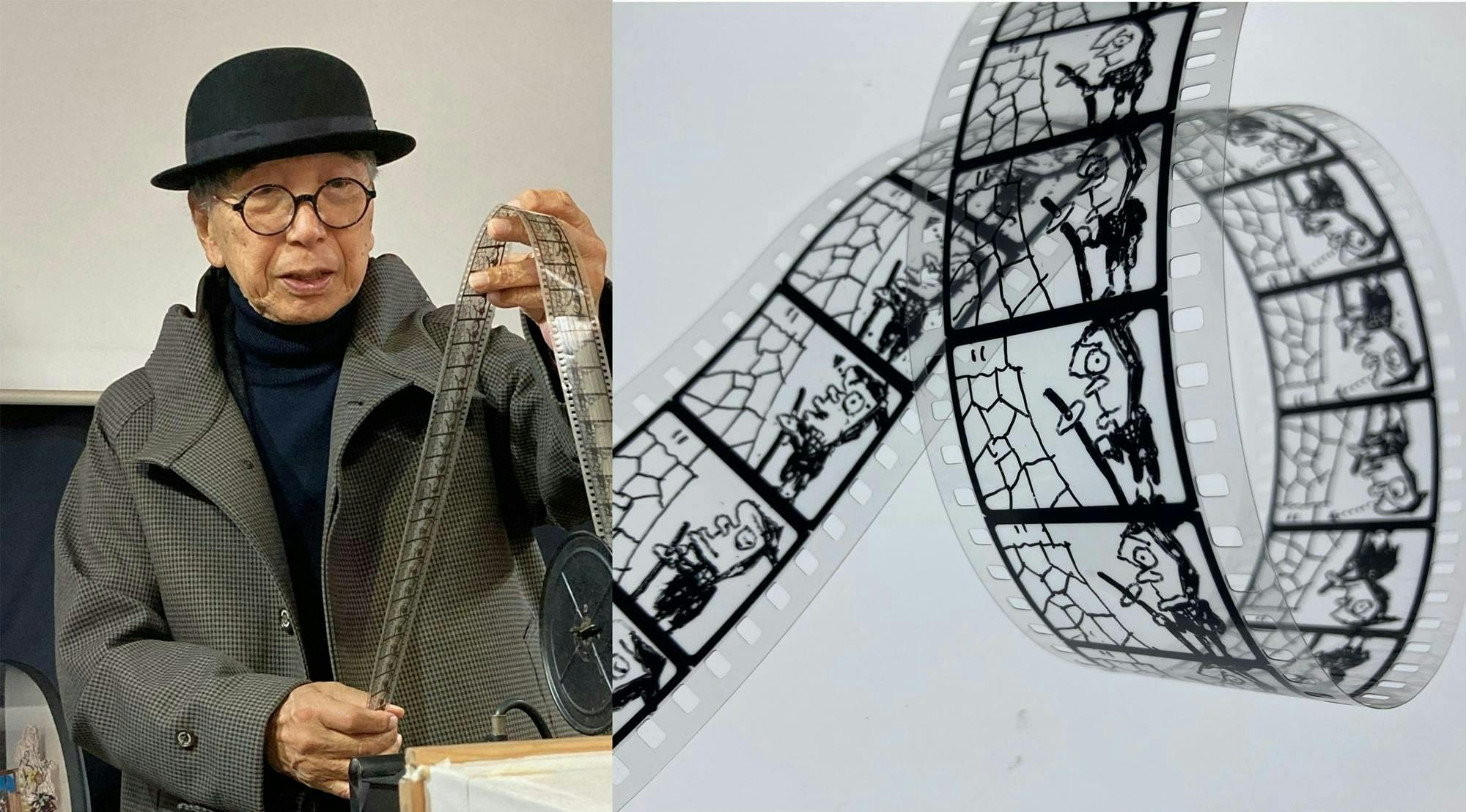 また、国産アニメ誕生100年を祝った2017年、古川タクさんに依頼して35㎜フィルムに手描きして貰いました。通常来館の皆様に手回し映写機で映写体験をして頂いている“あのフィルム”です。アニメーション(80コマのカリグラフ)のタイトルは『なまくら力 忍者篇』。現存最古の日本アニメーション『なまくら刀』へのオマージュです。今回は、その複製の35mmプリントを特別にご用意しました。