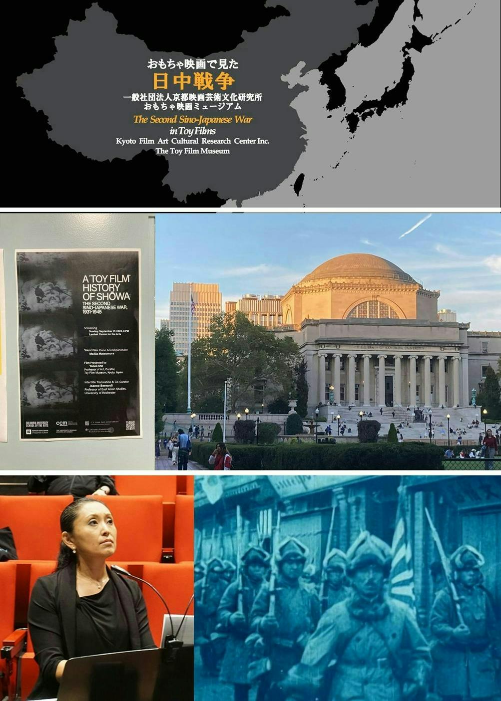 コロナ禍の中で作った『おもちゃ映画で見た日中戦争』は、大正から昭和にかけて販売されたおもちゃ映画のニュース映像を中心に、子供向け戦争漫画や時代を映したホームムービーも加え、負の歴史でもある忘れられた昭和史のアーカイブ映像を時系列に構成したものです。2022年3月第17回大阪アジアン映画祭で上映したほか、2023年9月17日アメリカのコロンビア大学(映画学部を世界最初に創設)で、ニューヨークで活躍されている松村牧亜さんのピアノ演奏付きで上映していただき、たいへんな好評を得ました。