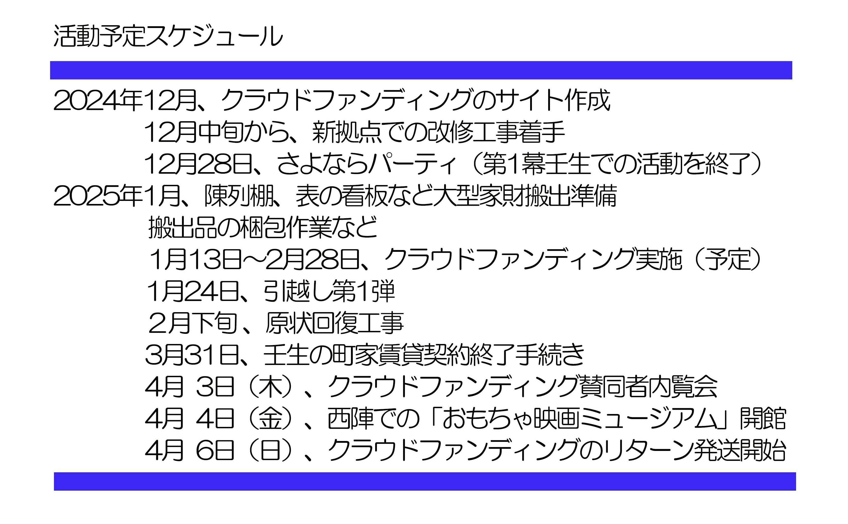 引越しの峠は越えましたが、まだ新拠点の改修工事や3月にかけて実施する原状回復工事が残っていて、いくら必要か実際にやってみないと分からない面があります。また、今後も継続した活動ができるようにもしたいです。お寄せ下さった皆様からの温かい支援金が、それらを賄っても余裕があれば、その時は、私どもが最終目標に掲げている産官学連携した「京都国際映画ミュージアム(仮称)」が設けられるための準備活動に使いたいです。桁が違うというのは重々承知していますが、自分たちにできることを一歩一歩進めて、なんとか夢を実現させたいです。