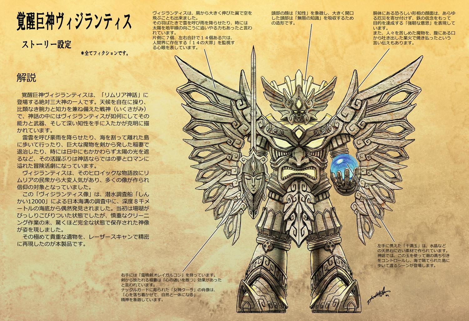 天候を自在に操り、比類なき腕力と知力を兼ね備えた戦神(いくさがみ)で、神話の中にはヴィジランティスが如何にしてその能力と武器、そして深い知性を手に入れたかが克明に描かれています。
