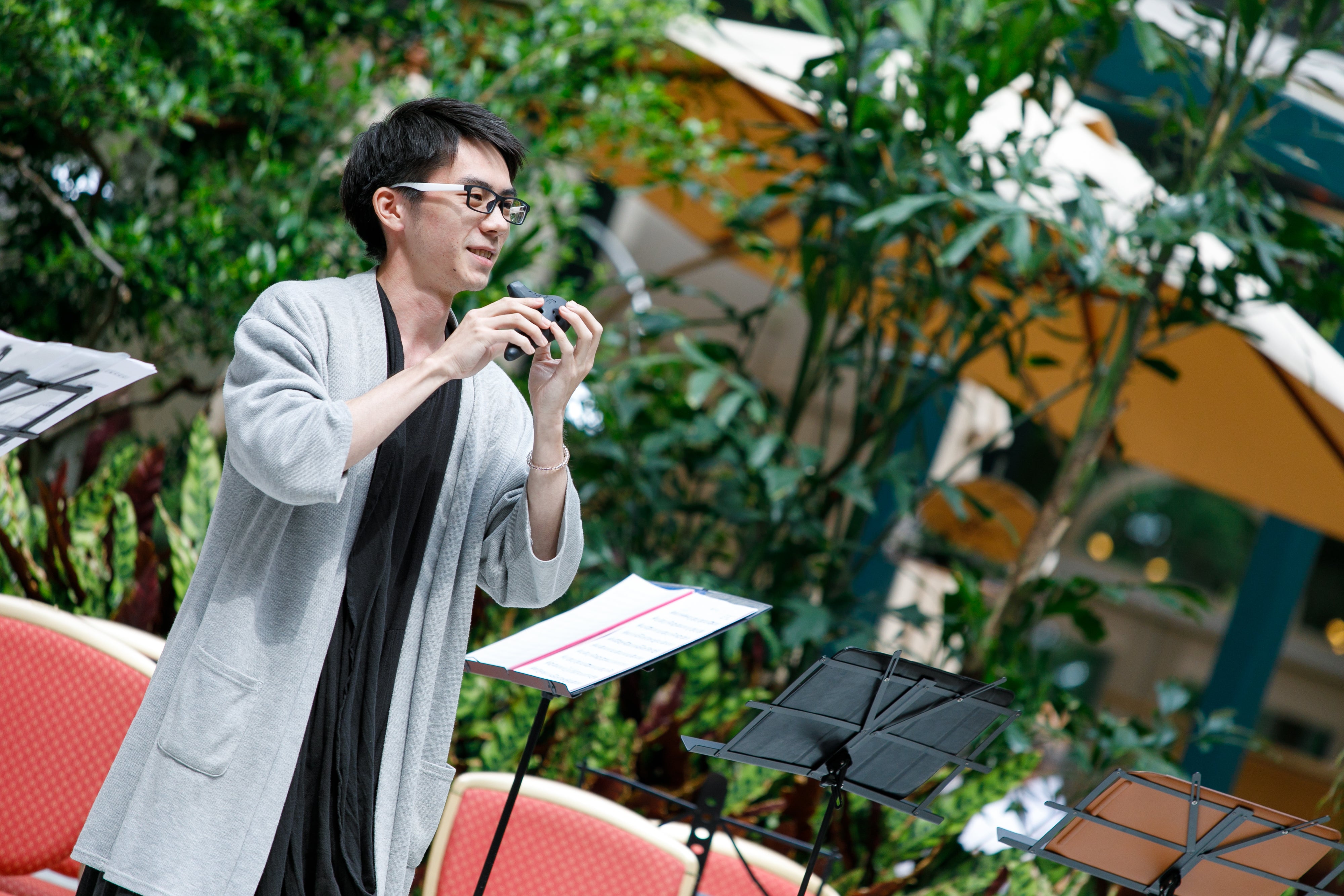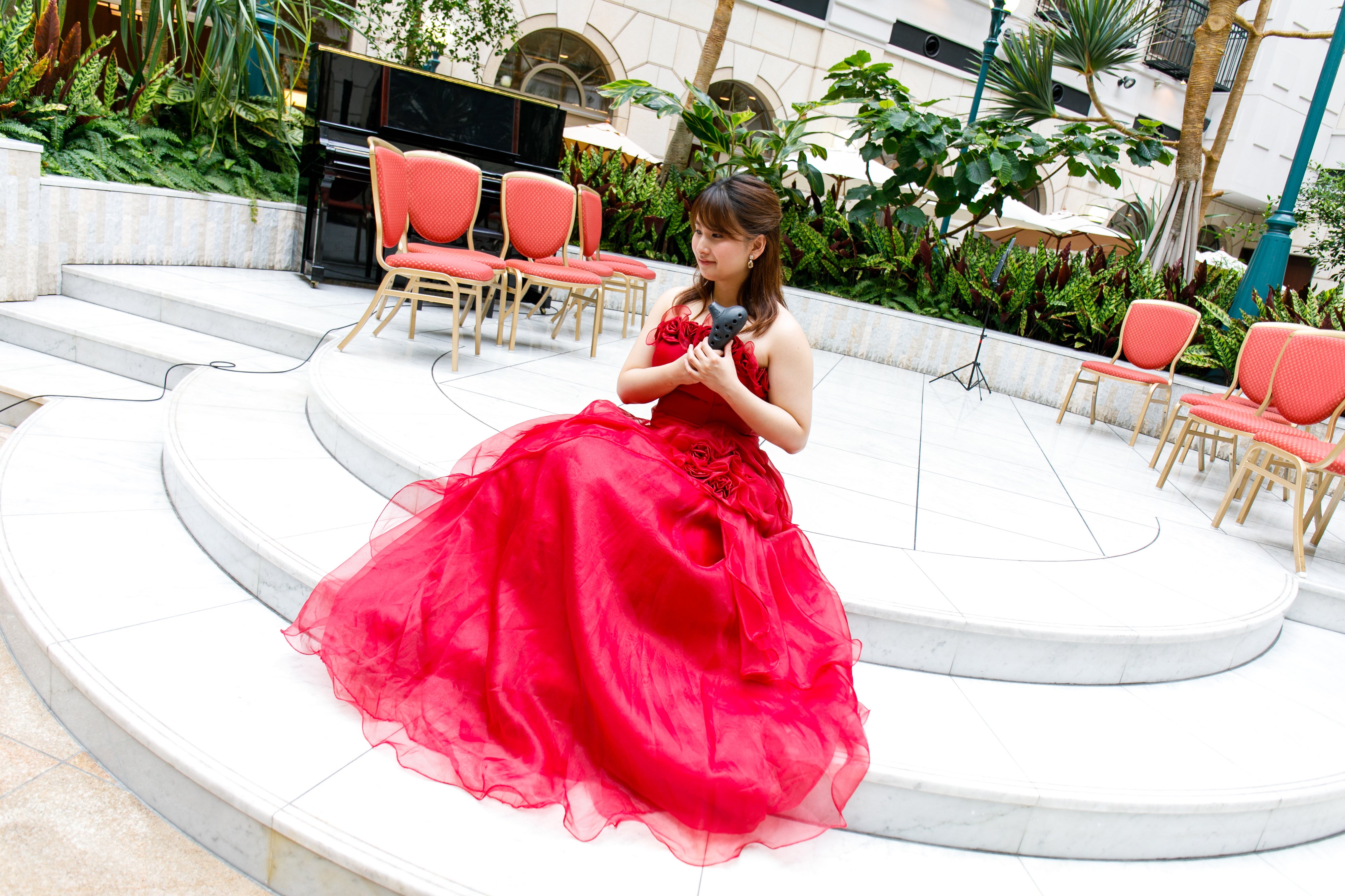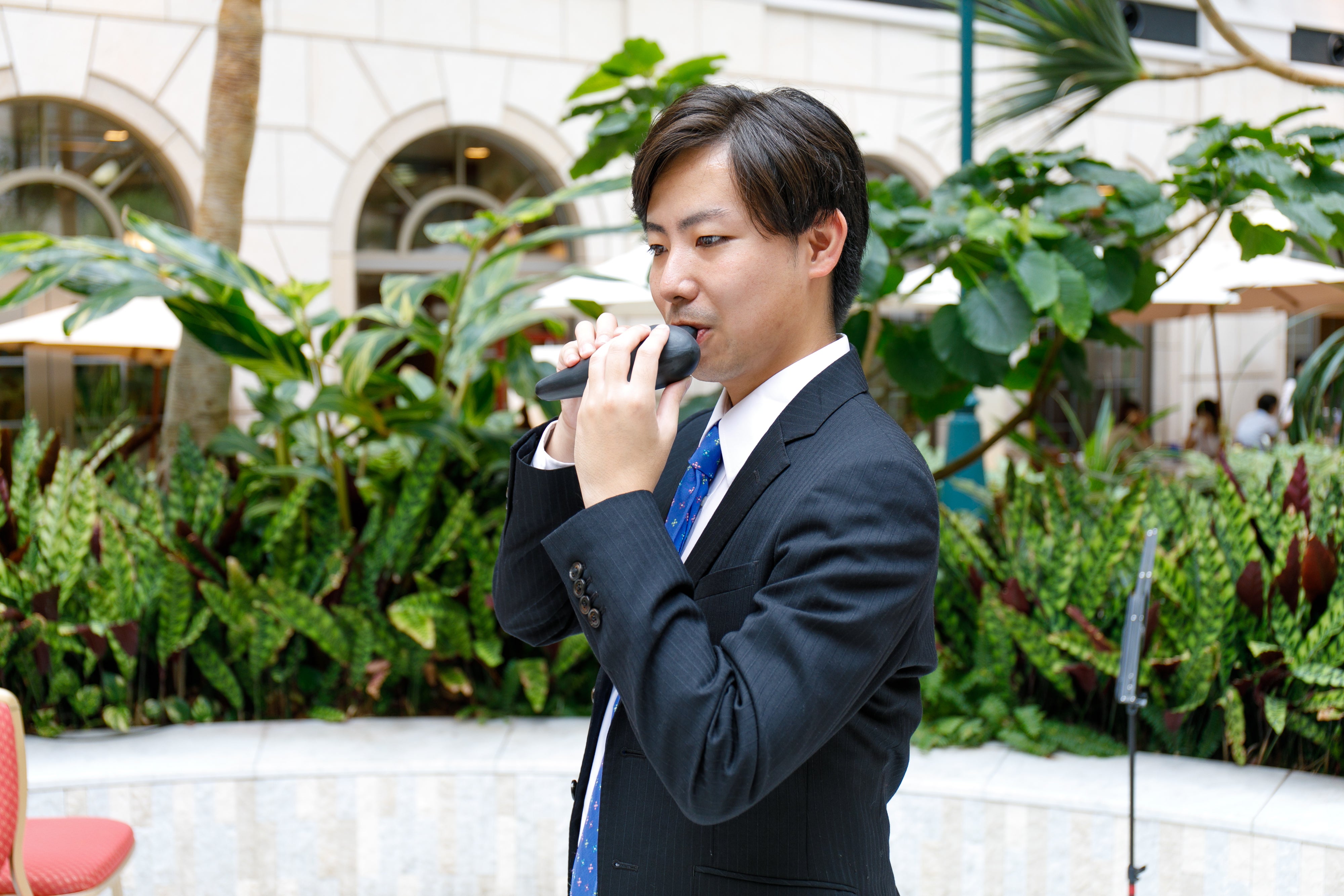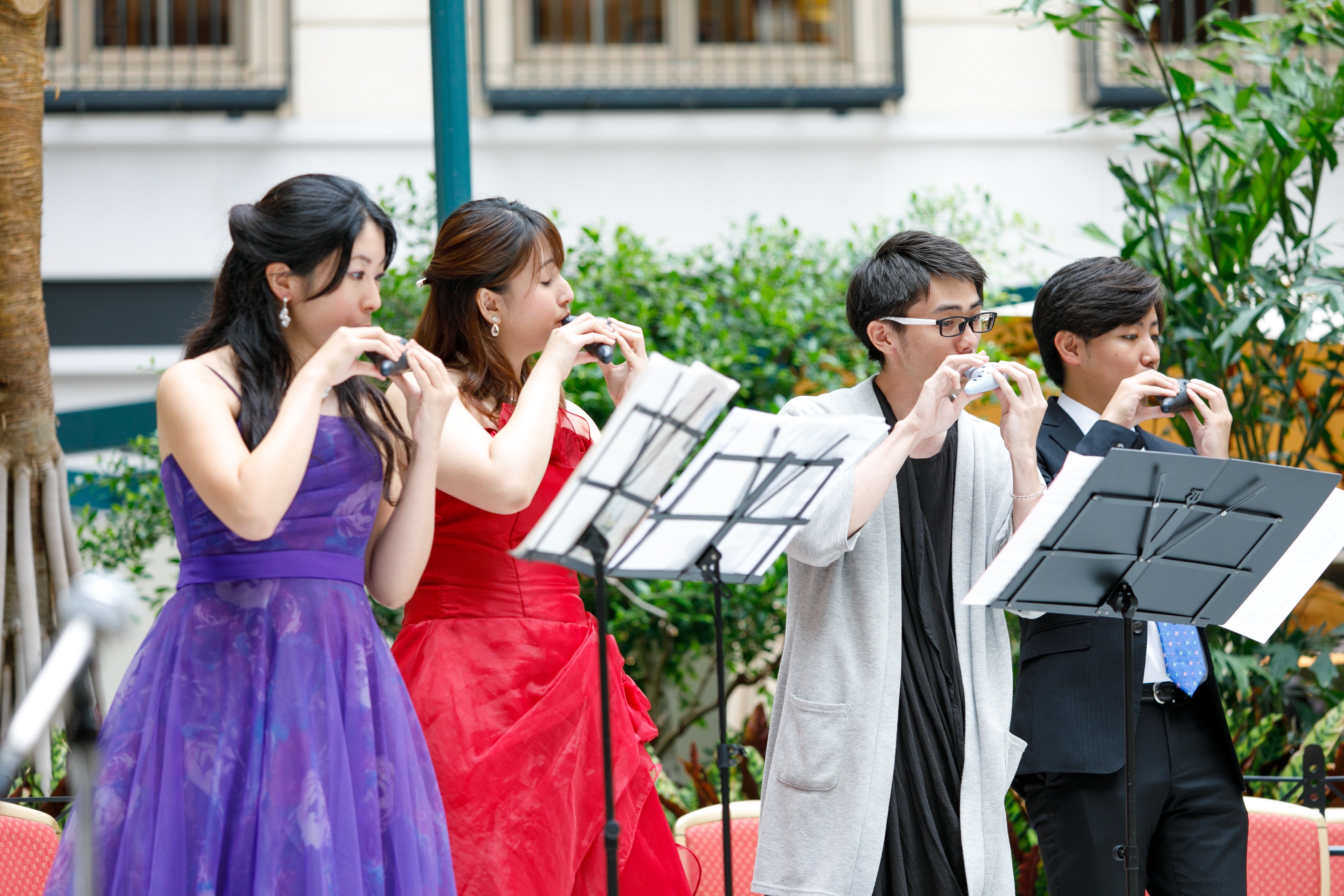 9月1日にプレ演奏する機会がありました。ホテルの中庭なので老若男女いろんな人に聴いていただける絶好の実験チャンスでした。オカリナを軸にして声楽・ピアノ・フルート・サックスを融合した2刀流演奏をしてみました。期待と不安でいっぱいでしたが見事に中庭におりましたホテルのお客様が、このグループのお客様になったのです。この瞬間いけると!確信しました。