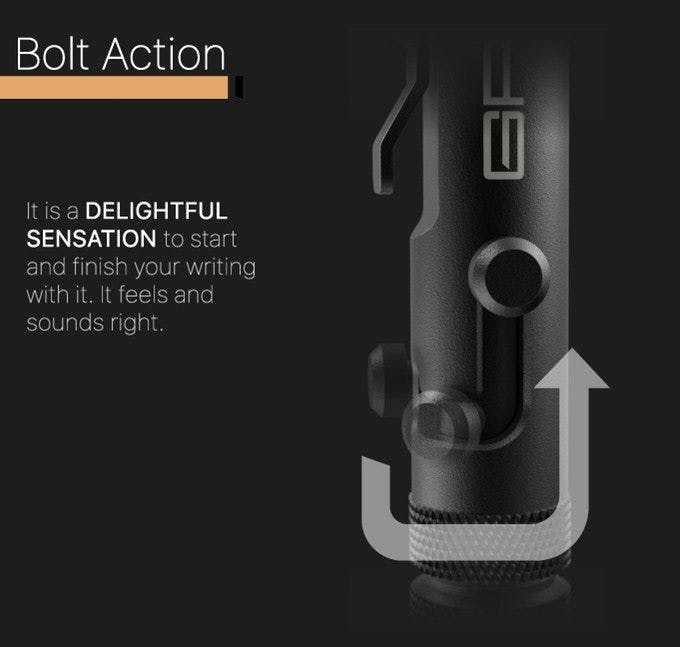 ボルトアクションによって意図しないペン先の飛び出しを防ぎ、金属音と感触は確実にクセになる操作感です。