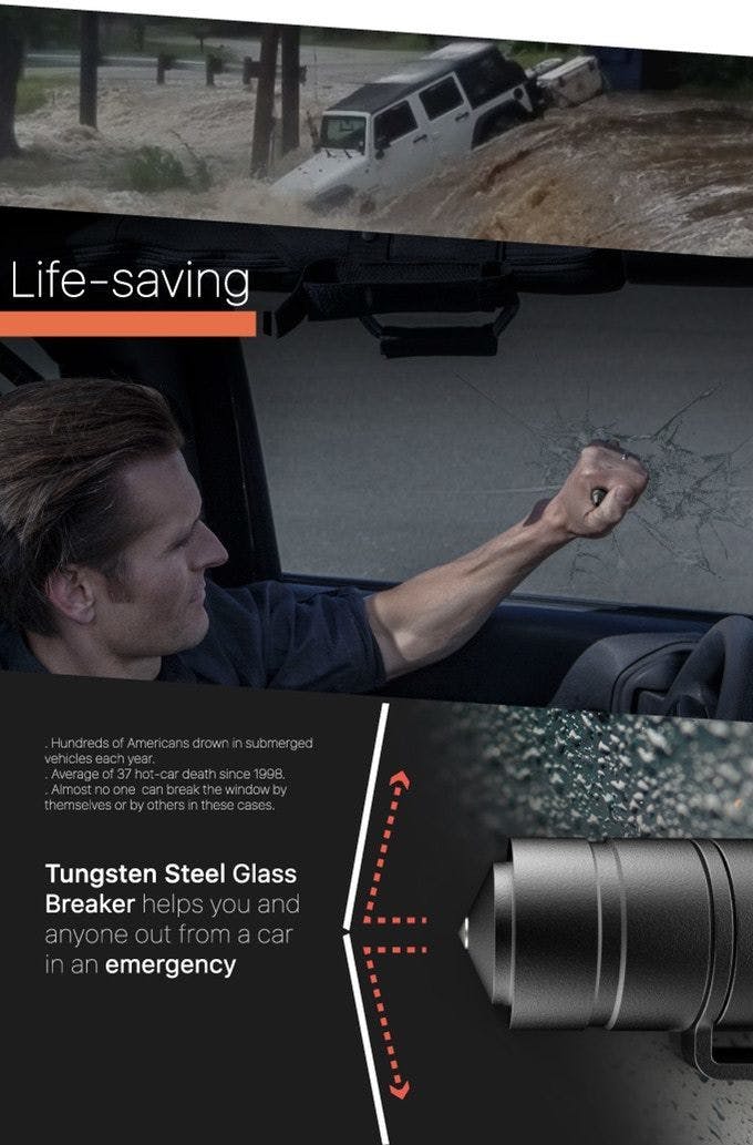 緊急時には車の窓ガラスを割ることができます。また実際に使用した際には割れたガラスが広がるように設計されていて怪我をしにくいような角度になっています。