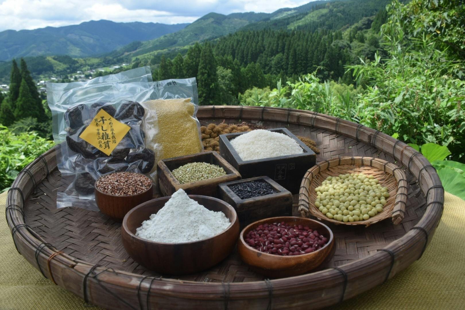 水上村の移住者で作る「焼き畑の会」メンバーが生産した無農薬米(4㎏)とそば粉、雑穀のセット